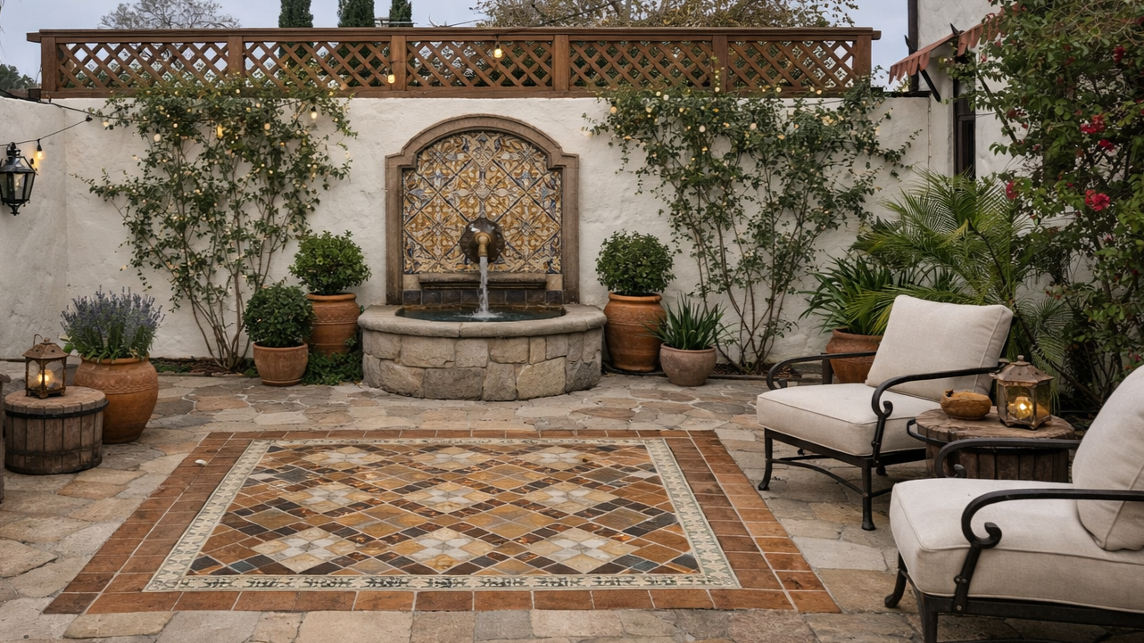 Stone shows wear on corners. Tile holds hairline cracks without collapsing the whole composition. Wrought iron oxidizes. Stucco takes small repairs and keeps going. The garden reads like something maintained by hands, not erased by perfection.