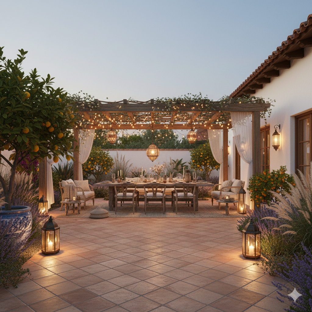 A Spanish Revival garden is planned around life first. Cooking. Arrival. Sitting in shade. Passing through an arch at dusk. It holds celebration. It also holds tension, scarcity, and the discipline of water.